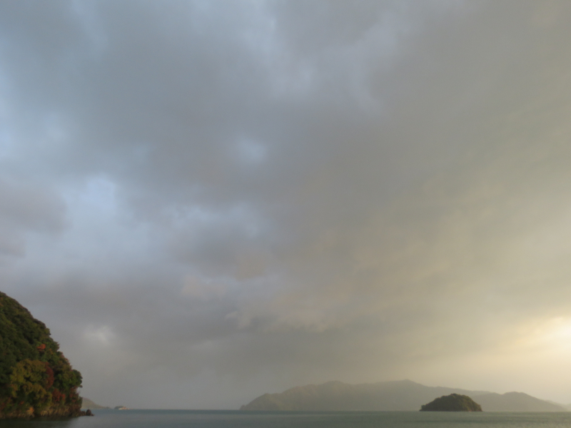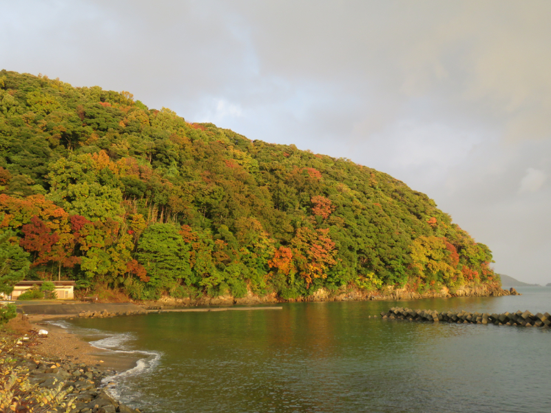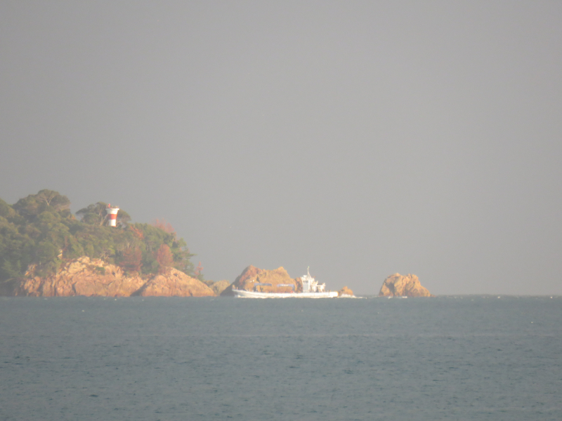 西寄りの強風が吹いています、時折陽が差し、色付いた片江鼻が浮かび上がります。赤礁赤灯台の前を定置網船が戻っていきます。